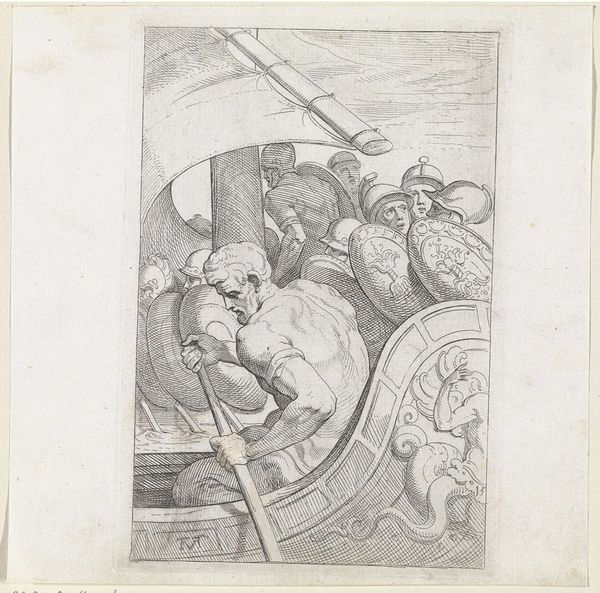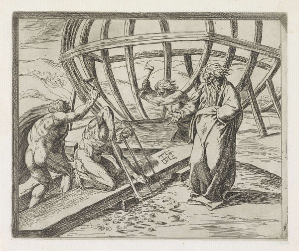 Cesare Fantetti's "Noah Building the Ark", made around 1660-1675, is an engraving, a printmaking technique that relies on the controlled removal of material. Look closely and you can see the hatched lines that build up tone and describe form. This wasn't just drawing, it was manual labor. Each line meticulously cut into the metal plate with a burin. The artist’s hand guided the tool to create a composition that is part drawing and part sculpture. The image itself depicts the ultimate construction project. The figures around Noah are immersed in their labor: chopping, sawing, lifting. They are realizing a design that comes from above. Consider the cultural significance of this scene. Is it not only about salvation through divine intervention, but also about the dignity of work? About taking raw materials and shaping them, board by board, into something that can carry us through the storm? The value here, literally, is embedded in the making.
