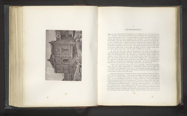 Curator: Thomas Annan's "Slatefield," dating back to before 1878, offers us a glimpse into a very specific time and place. The image itself is mounted within the pages of a book. Editor: My immediate impression is of a kind of stark, melancholic beauty. It feels very much rooted in its time. I’m drawn to the texture of the aged paper around the mounted photograph itself. Curator: I’m also interested in how the physicality of the book form, the materials used, impacts our perception of this building, and our encounter with this photograph. We have this industrial printing alongside this older building it shows. The means of production, how readily available this information became, feels crucial. Editor: Absolutely. And what does the building itself signify? That solid, symmetrical structure with the stark windows… there’s a sense of permanence and order, maybe even authority, contrasted against the skeletal tree in the foreground. It feels like winter, dormancy, even a hint of decay encroaching upon this symbol of stability. Curator: It makes me think about class and the representation of labor too. Annan was commissioned to document these changing landscapes, and that was, fundamentally, about labor – who owns the means of production, who controls the land. This volume served a function. It recorded for posterity. Editor: The handwritten script alongside the image adds another layer, doesn’t it? It roots the image in a specific narrative, a kind of historical record, giving the building a clear context and a sort of cultural weight, embedding this building as more than bricks and mortar. It gives the building a soul. Curator: By framing "Slatefield" within the book's context, we see the interplay between preservation and transformation through reproductive technologies and their access points. Editor: I agree. Ultimately, "Slatefield," immortalized in ink and photograph, speaks to how the seemingly mundane acquires layers of meaning over time.