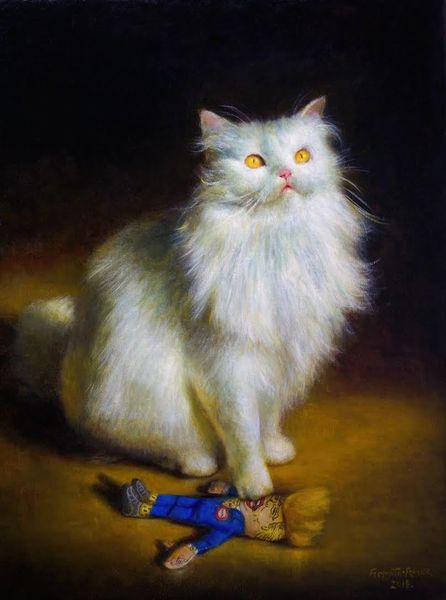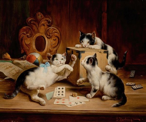 Editor: This delightful oil painting is called "The Kitten's Art Lesson" by Henriëtte Ronner-Knip. It features a gaggle of kittens making a playful mess of an artist's studio. The composition is just charming. What strikes you about this piece? Curator: I'm intrigued by how Ronner-Knip positions domesticity, especially considering the historical context of women artists in the 19th century. Do you see any subtle commentary on gender roles in this seemingly simple genre painting? Editor: I hadn't considered that. It mostly struck me as just cute. The kittens are, you know, adorable. Curator: Consider the art world at that time. For a woman, depicting domestic scenes, even with animals, could be a way to navigate those limitations but also subvert them, gently pushing at boundaries. Think of the gaze; are these cats truly learning, or are they acting out some commentary of the performative act of learning? Editor: That's interesting. So you're suggesting that the kittens might be symbolic of women's roles, playfully engaging with, or even undermining, the traditional artistic practices dominated by men? Curator: Precisely. And look at the adult cat. Her sad and knowing glance might be a parallel to the woman artist's, observing her 'students’ with knowing experience. Is she weary of fighting, or complicit in perpetuating inequality? This makes "The Kitten’s Art Lesson" much more than just a cute depiction. It prompts questions about power, creativity, and representation. Editor: Wow, I will never look at it the same way again! I appreciate how you contextualize what might appear to be just “genre-painting.” Curator: That is where art surprises and enriches; we never see things the same way again!