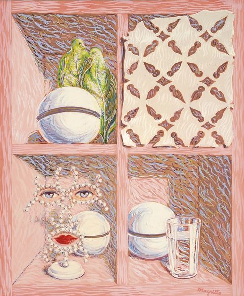 Curator: Magritte’s “Le Musée d’une nuit” employs a mixed-media approach; it appears deceptively simple. These objects placed within separate compartments give off an eerie and dream-like aura, wouldn’t you agree? What jumps out to you? Editor: I do see the strangeness in these common objects placed in what resembles a wooden shelving unit, almost like a shadow box. How might the construction itself be telling us something? Curator: Well, consider the materiality. What strikes me immediately is the almost insistent frontality of it; the insistent display of both "high" and "low". We have a clear tension between craft, or perhaps trade, with that wood grain; alongside this is fine art – represented, albeit strangely, with the bird head, glass and so on. How can you relate it? Editor: It almost feels like a flattening of value. All these objects are presented in the same manner, regardless of their origin or perceived cultural value, it disrupts any sense of hierarchy between the objects. How does Surrealism plays into that flattening? Curator: Precisely. This elevation of the mundane, executed with precise skill in its painting, highlights how deeply material conditions can be interwoven with our perception of art. And also, whose perspective matters: Magritte made his paintings available for more general appeal by doing more editions. Do you think it helped him to reach larger audiences? Editor: I would think that it made him gain popularity with audiences, as opposed to other surrealist painters who were adamant of not sharing their work because the value relies on exclusivity. I hadn’t thought about the artist's engagement with production so deeply before. Curator: Absolutely, and this piece really drives home the artist's involvement, because the creation isn't hidden in some sort of obscure high society bubble. It puts labour and process into sharp focus, forcing us to think about the act of creation alongside the image itself.