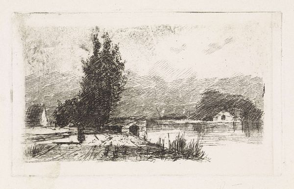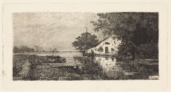Editor: So, this is "Gezicht op de Sint Urbanuskerk te Bovenkerk" from 1887 by Elias Stark. It's an etching, and it has a rather peaceful, almost melancholic feel to it. All that soft light and stillness... what strikes you most when you look at this print? Curator: It reminds me of those Sundays where time seemed to slow down to almost nothing, the kind where even the water seems to be holding its breath. There's such tranquility. It's also remarkable how Stark captures light with etching, which isn't always the easiest task. Do you notice how he suggests form through tiny, precise strokes? Almost like he's whispering details onto the plate. Editor: Yes! The details are incredible, considering the medium. And there are figures in the foreground, by the water… Is that typical for landscapes of the time? Curator: Well, including figures like that grounds the divine in everyday life. The church in the background is central but made accessible by the figures fishing by the shore, almost inviting the viewer into that contemplative space. And there's a subtle story being told there too; are they locals? Visitors? What is their relationship to the church? Editor: That’s fascinating. It's like Stark is using the landscape to pose bigger questions. Curator: Exactly! And maybe, also showing that life, with its everyday motions, keeps happening against a background of something solid and constant like the church. I almost want to jump into that scene! Editor: Now that you point it out, it does have this effect. This landscape feels both intimate and timeless at once. I'm really going to be thinking about this print for a while. Curator: Me too! And isn’t it wonderful when a piece manages to capture both the grand and the quiet truths of existence in a single, serene frame?