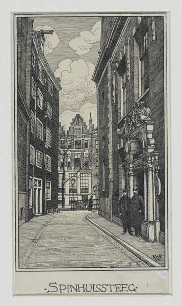 Curator: Welcome to the Rijksmuseum. Before us hangs Willem Wenckebach’s pen and ink drawing, "Taanstraat te Amsterdam," dating from between 1870 and 1926. Editor: My first thought is somber, almost oppressive. Those densely hatched buildings loom over the narrow street. There's an overwhelming verticality to it. Curator: It’s intriguing to consider the production. Wenckebach meticulously layered ink strokes to build form and shadow. The hatching technique isn't just descriptive; it's the labor made visible. Editor: But look at those stepped gables, the dormer windows. Each one is slightly different, asserting individuality against the uniformity of the street. Gables in Dutch art traditionally represent family lineage, aspiration, even prosperity. Do you think there's commentary here about the illusion of these status symbols? Curator: Potentially. Wenckebach certainly gives equal attention to the mundane details, like the street paving and the single figure standing there. The buildings are not idealized. Consider the materials: humble paper and ink transformed through skilled labor into this durable image. Its endurance also tells us something about social and economic changes to streetscapes over time. Editor: I see a lone figure by what seems like an entryway; I wonder, are we meant to project ourselves into that isolated character? There’s a clear, deliberate construction here of 'Dutch-ness.' Can't you sense a tension between reality and the picturesque ideal of Amsterdam being built through this drawing? Curator: I think that friction is precisely what makes it a valuable historical document, it acknowledges the lived realities inherent in urban development. A contemporary viewer can see the work not only for what it represents, but how it was made, and what conditions shaped both subject and artist. Editor: This image definitely encourages contemplation, prompting us to decode the hidden cultural signals woven into a seemingly simple street view. Curator: Yes. Reflecting on materials, method, and symbolism definitely enriches our reading of the piece.