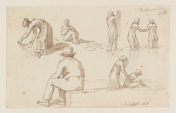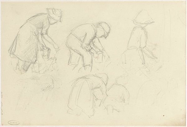Curator: This is Sir William Rothenstein's drawing, "Potato Planting," held here at the Tate. It gives me a sense of quiet industry. Editor: The bent figures, the muted tones... it certainly evokes a sense of weighty labor, almost ritualistic in its repetition. The pickaxe seems particularly emblematic. Curator: Indeed. Rothenstein's choice of such a stark, utilitarian scene speaks volumes about the role of agricultural labor in society. The very act of planting is a fundamental production. Editor: And potatoes! Humble, sustaining. Their presence resonates with deeper symbolic meanings of nourishment and earthly connection. Curator: It's a poignant reminder of the human connection to the land and the labor that sustains us. Editor: A somber, yet hopeful image, revealing the symbolic weight in the simplest of actions.