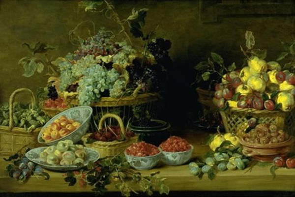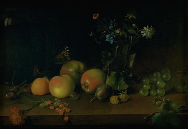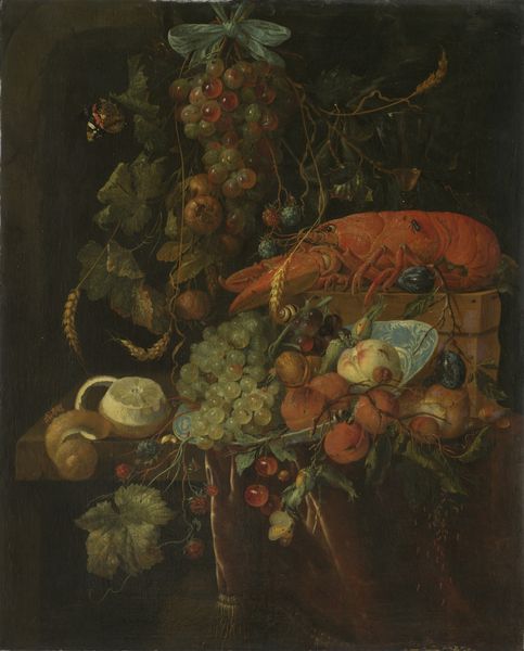 Abraham Mignon created this painting, Still Life with Fruit and Oysters, employing oils to capture a vivid scene. The composition is dominated by a rich collection of objects set against a dark backdrop, creating a striking contrast that highlights the textures and colours. Mignon masterfully arranges an array of fruits, oysters, and ornate glassware, each rendered with meticulous detail. The scene overflows with symbolic suggestion, typical of the still-life genre. The dark background serves not just as a void but as a critical element that pushes the objects forward, intensifying the experience. Notice how the artist uses light to pick out the textures of the oysters and the sheen on the grapes, enhancing their sensory appeal. The arrangement isn't haphazard but a deliberate construction meant to engage the viewer’s gaze and prompt contemplation about abundance and transience. The objects are not merely represented; they are composed to challenge our understanding of luxury, decay, and the complex relationship between art and nature. The painting thus functions as a semiotic field, inviting continuous interpretation and re-evaluation.