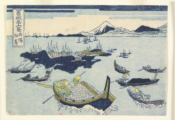Curator: We’re standing before "Mt. Unzen," a striking woodblock print created in 1936 by Unichi Hiratsuka. Editor: Ah, there’s something about it that’s immediately soothing. It’s minimalist, almost elemental in its shapes and colours. And the way those horizontal water ripples catch the light--truly sublime. Curator: Indeed. The ukiyo-e influence is very apparent. Look at the simplified forms—the almost block-like representation of the houses against the mountain range. There’s a very deliberate organization here. The composition directs the eye in layers: water, then shore, up to the mountains, and finally the sky. Editor: It’s clever, how Hiratsuka plays with the horizon line. The line cuts across, yet each horizontal division—water, land, sky—presents us with a distinct emotional texture. Like memories of distinct days along the same coast. Curator: You’ve intuited one of the most compelling qualities of this print, and of ukiyo-e generally—how they distill lived experience into essential, elegant forms. The use of woodblock printing enhances this effect, creating a tactile texture within a serene image. Notice how the application of colours contributes to a unique depth—even within such a simplified style. Editor: Almost like the image becomes about more than just looking at the view but feeling its resonance, its place in time and memory. Curator: Precisely. It engages not merely our sight, but our understanding of how form shapes our world. A compelling harmony between idea and execution, if you will. Editor: Yes, a very successful meditation on space. I wonder how that lone boat floating within those cool waters interprets its place within the whole landscape…It almost looks trapped between two conflicting emotions: the warm coast, the blue ocean…It seems both exposed and shielded, maybe representing the fleeting present as we view it! Curator: A most stimulating interpretation. I hadn't considered the boat as a metaphor... Editor: Thanks. Well, for me, the experience shifted, and a certain quiet reflection bloomed.