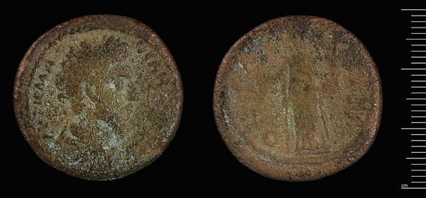 Curator: Here we have a coin of Perge under Philip I, the Arab. It's quite weathered, isn't it? Editor: Yes, it feels heavy with time, like a little portal to another world. The wear and tear almost add to its allure, making it seem more authentic. Curator: It's incredible to think of the hands this coin has passed through. Philip I, you know, had a relatively short reign but quite an impact. Editor: Absolutely. The imagery is intriguing. I see a structure, maybe a temple? Symbols of power and permanence, even though empires crumble. There's a human need to make our mark, and it's etched on this coin. Curator: Indeed! It's more than just currency; it's a statement. Editor: Looking at it makes me reflect on what we leave behind, what endures, what fades... Curator: A lasting impression from a fleeting existence.