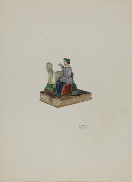 Curator: Well, this piece definitely sparks something in me. Is it the vaguely haunted look in Uncle Sam's eyes? Editor: We’re looking at a coloured pencil drawing of a "Toy Bank: Uncle Sam" dating back to around 1937, by Kurt Melzer. Curator: Yes, haunted but also… determined? Like he’s seen some things, and he's *still* trying to sell you on the American Dream, one penny at a time. It is odd, the colours have a soft, childlike quality, which only amplifies the strangeness. Editor: Absolutely. And seeing Uncle Sam rendered in such a, seemingly innocent medium raises interesting questions. What did this symbol, so laden with meanings of nationhood, opportunity, and often exclusion, represent to someone creating art in this specific historical context? The late 30's was, of course, smack in the middle of the Depression. Curator: I wonder if that softness, that vulnerability in his face, might be a reflection of those times? The country on its knees, a need for… I don’t know… a kinder, gentler Uncle Sam? Editor: The colours could indicate a deliberate attempt to present this complex national figure in a palatable way for the masses, especially for children learning about patriotism and the value of money. And of course the very title tells us it is about commerce. Curator: I can imagine a kid, painstakingly saving up coins to drop into that outstretched hand. There is a slightly desperate air to this toy, wouldn’t you say? Maybe children were learning more about precarity at an early age. Editor: Considering that the U.S. was slowly emerging from a severe economic crisis and preparing for the looming shadow of war, there's a potent irony here, capturing both the aspirations and anxieties of a generation facing uncertain futures. Curator: Hmm. So the real art here might be in the tension. What an intriguing piece of cultural commentary disguised as child’s play! Editor: Precisely! It urges us to consider the stories behind the image, the power dynamics at play, and how such a common place, symbolic object embodies a deeper collective history.