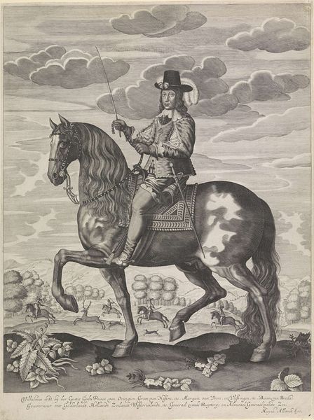 This print portrays William III, Prince of Orange, and it's made by an anonymous artist using engraving techniques. Looking closely, you can see how the material characteristics of the metal plate from which this print was made influence its appearance, with its fine lines and tonal variations. The engraver would have used a burin to carve lines into the metal, a laborious process that required great skill and control. The precision and detail achieved reflect a mastery of craft, as the lines create a sense of depth and texture, bringing the prince and his horse to life. The act of creating such a print was deeply entwined with social context. Prints were a means of disseminating images and ideas widely, catering to a growing market of consumers who wanted to own representations of power and status. Recognizing the labor and expertise involved in this work challenges the traditional distinctions between fine art and craft.