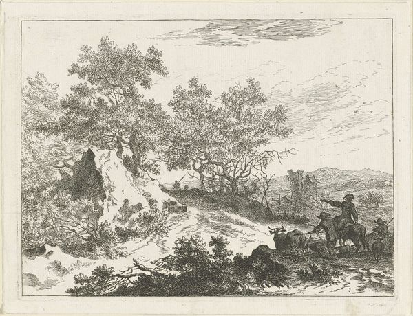 Editor: Here we have "Mountainous Landscape with Shepherd and Cattle" by Johannes Janson, created sometime between 1761 and 1784, it's an etching. It feels like a snapshot of rural life, a really idyllic scene. What story does this landscape tell, in your opinion? Curator: This piece is quite interesting when viewed through the lens of its time. The late 18th century saw a rising interest in depictions of nature, fueled in part by Enlightenment ideals and the growth of landscape painting as an acceptable subject. This etching, with its emphasis on the shepherd and his livestock within a vast mountainous setting, idealizes rural life and reflects a societal longing for a simpler existence, one perceived as untainted by urbanization. What do you notice about the way the artist uses line and composition? Editor: It’s almost… nostalgic? I mean, the way everything is so neatly arranged, and the line work feels so delicate. It makes me wonder, was this ‘simple’ life really as uncomplicated as the artwork suggests? Curator: Exactly! And that’s where considering the social and political context becomes important. Representations like this served a function, shaping perceptions of rural life, even obscuring its harsh realities for many. It prompts us to think critically about the power of imagery to construct narratives and reinforce certain social values. How do you think museums play into perpetuating this view of "idylic" history? Editor: It’s definitely given me something to consider – the social forces that shaped how we perceive rural life. It changes how I appreciate the print, really. Curator: It’s all about understanding art as a product of, and a contributor to, the historical narrative. I leave seeing these romanticist landscapes with wanting to find how ordinary folks were actually represented back then.