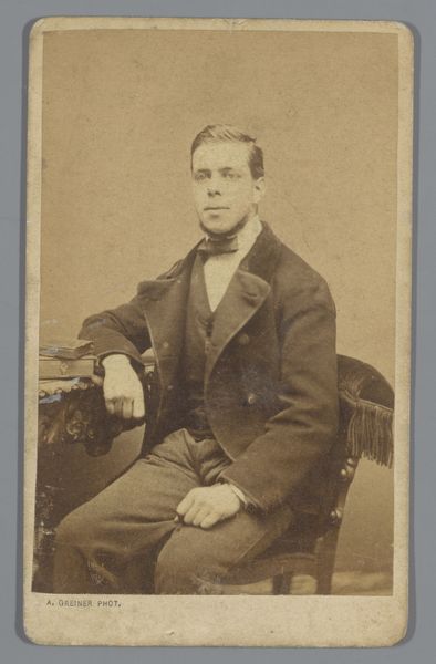 Editor: Here we have "Portret van een onbekende man" by Hermanus Jodocus Weesing, a gelatin silver print likely from the late 19th century. He looks very serious and… proper. The sepia tone adds a certain weight. How do you interpret this work? Curator: Consider how the formal portrait, popularized in this era through photography, functioned almost like a secular icon. The stern gaze, the carefully chosen attire, even the way he's seated – it's all constructing a very particular message about social standing and character. Don't you think the slight asymmetry adds a note of… truth, shall we say, that prevents it from being purely a symbolic type? Editor: Truth, like, despite the artifice of portraiture, something authentic comes through? The unsmiling expression reads differently now. Curator: Precisely. It prompts one to ponder about the role of the individual versus societal expectations. Think about it - the sitter is presenting a carefully curated image of himself, a deliberate construction to be consumed by posterity. Editor: So the photo is showing a message about an individual in his specific era. But maybe the symbolism isn’t as intentional, at least on his part? Curator: Intentionality is only one layer. He might have felt pressure to project such an image. Editor: Interesting! I’ll never look at old portraits the same way. Curator: Nor will I. Each glance reveals hidden facets, echoing conversations across centuries.
