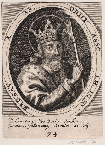 Curator: Here we have a print titled "Kong Høder," dating back to 1646, currently held at the SMK, the National Gallery of Denmark. Editor: My initial impression is one of solemnity. There's a starkness to the engraving, the fine lines creating a rigid yet refined depiction of this royal figure. Curator: It’s fascinating to consider the means of production. Engravings like this were crucial for disseminating images and ideas in the 17th century. The act of meticulously carving the image onto a metal plate, in reverse, demands immense skill and labor. How might the relative ease with which prints were consumed affected ideas about royal power, its accessibility, and permanence? Editor: Absolutely. And look at the orb and scepter he holds, these are timeless symbols of authority and dominion. The artist emphasizes them to connect "Kong Høder" with a legacy of kingship that stretches far beyond his own time. And note the crown, seemingly inspired by the crowns worn during the Renaissance period to reinforce claims of succession, dynastic consolidation, and historical justification. Curator: I'm particularly drawn to the text framing the image, “Hotherus nepos Suanhvidæ sorori Frothonis I. Rex, Daniæ, Sueciæ, Sclauoniæ,” Hotherus, nephew of Suanhvida, sister of Frotho I, King of Denmark, Sweden, and Slavonia, isn’t just a name. These carefully crafted letters speak volumes about the engraver's labor and craftsmanship. Consider how prints were instrumental in constructing notions of lineage, territory and ultimately, identity. Editor: And the artist utilizes the oval frame to focus our attention on Høder’s face. It is like looking through the looking glass onto another, different time period. His somewhat intense gaze confronts the viewer, asking us to grapple with the weight of history and its meaning, particularly as transmitted to us. Curator: Thinking about this print, and how it would have been used and distributed, prompts me to think about our modern modes of communication and artistic representation today. Editor: For me, it's been intriguing to consider how enduring symbols coupled with historical representation work to transmit meaning across centuries.