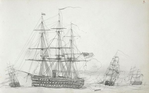 Curator: Before us is "Two Ships at Anchor," a pencil drawing by John Constable, created in 1803. Editor: It’s surprisingly delicate for a maritime scene. There's a quiet, almost ethereal quality to the ships and their reflections, especially considering the robust nature of seafaring at the time. Curator: Indeed. What I find particularly interesting is Constable's process. As a landscape artist, his acute observation of nature extends here. Notice how the varying pencil strokes build texture— suggesting not just the physical structures of the ships but also the subtle movements of water and light. We see labor recorded here. Editor: It makes me consider the naval context of the early 19th century. The Napoleonic Wars were raging, and ships weren’t merely vessels of trade; they were instruments of power and protection. Does Constable allude to England's maritime dominance or is it a more introspective study? The political environment surely influenced how such scenes were both produced and perceived. Curator: I think it speaks to the Romantic movement, where artists like Constable sought to capture emotional truths and personal experiences within grand themes. This drawing could be read as a counterpoint to the idealized heroic portrayals of ships, and it focuses on their everyday existence when docked or at rest. Editor: Interesting. Consider, too, that Constable was closely tied to the Royal Academy. To what degree was he working within or against those institutional expectations, even in these smaller studies? Was this piece for public consumption, or private contemplation? Curator: Good question! Considering it's a pencil drawing, a preliminary study rather than a finished oil painting, perhaps it allowed him more freedom to explore atmosphere and feeling without the constraints of formal exhibition. Editor: It does raise fascinating questions about the interplay of art, power, and perception in his time. Curator: I agree. Constable shows a sensitivity to his environment while reminding us that material, practice and labor were an intimate component of representation. Editor: The quietness of the image belies the busy narratives it triggers.