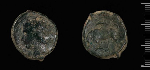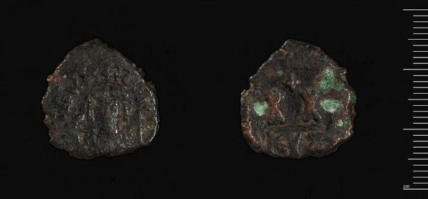 Curator: Here we have a Follis of Herakleios, Constantinople. It was created by Abd-al-Malik, of the Umayyads. Editor: It feels ancient, doesn't it? The patinated copper whispers of a world long gone. Almost primal, earthy. Curator: Absolutely. And consider this: it's not merely a relic but a product of Byzantine craftsmanship, reworked under Umayyad rule. A testament to shifting power. Editor: It's all about labor, isn't it? The physical act of striking this coin, the economies it fueled… it's tangible history. Curator: For me, it's the faces of history that speak through the wear and tear of this coin. To imagine its journey, who might have held it... Editor: Yes, and those very hands, driven by political and material forces, shaped this small object we're contemplating today. Curator: Ultimately, it's a tiny portal connecting us to the past, a reminder of fleeting reigns. Editor: Precisely, a constant dialogue between production, power, and our own understanding of value.