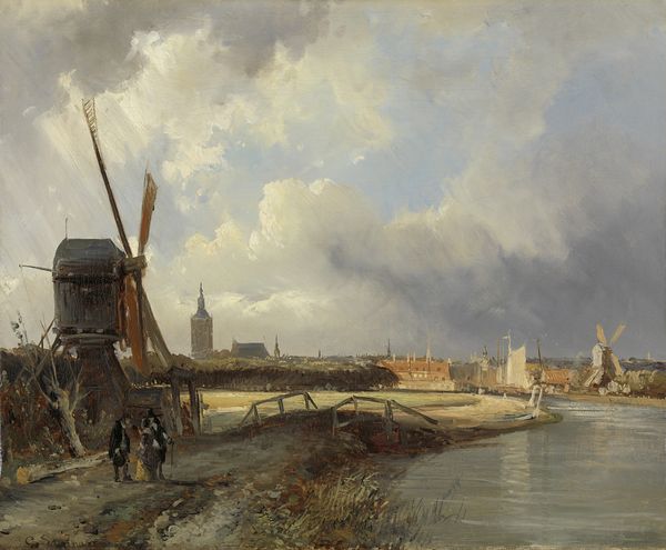 Curator: Abraham Johannes Couwenberg created this oil on canvas titled "Frolicking on a Frozen Canal in a Town" sometime between 1830 and 1837. It's currently held in the collection of the Rijksmuseum. Editor: The muted color palette immediately strikes me. It feels rather melancholic, despite the figures engaged in what should be joyful winter activities. There’s a kind of wistful beauty to it. Curator: Consider the socio-economic conditions. It’s painted during a period of industrial change. The focus isn't on the urban centers, but the traditional modes of life. We see evidence of the infrastructure that enables it – the frozen canal as a winter road. Editor: That's a great point. Look at the diverse group of figures populating the scene. Rich, poor, old, young—all united, almost democratized, by this shared public space of ice. The artist depicts a brief interlude where societal differences are somewhat blurred through the simplicity of leisure. Curator: Precisely. And in contrast, the solid presence of the windmill becomes a reminder of Dutch labor. It reflects a culture deeply invested in utilizing their environment for both transport and industry, even in frozen conditions. The frozen canal represents not just leisure, but continued commercial possibilities despite harsh weather. Editor: You know, there’s a fragility present too, even a political charge. The Romantics were interested in the ephemerality of nature and society. It makes me consider what moments like this—moments of collective joy—mean when social and economic realities are much harsher. Does art preserve those, or provide an escapist fantasy? Curator: Perhaps both, concurrently. This piece doesn't necessarily glorify labor. The focus remains on the temporary winter scene. The making of it through oils, a commodity in itself, becomes a lens into how these leisurely moments were viewed and perhaps, even valued by the wealthy. Editor: It’s interesting to see how an artwork celebrating seemingly simple pleasures contains so much socio-economic layering, how painting becomes a means of capturing and understanding social experience. Curator: Agreed. Considering Couwenberg’s materials and choices in the social context gives us a different perspective of the history behind this painting, a frozen canal revealing the ebb and flow of a town's society.