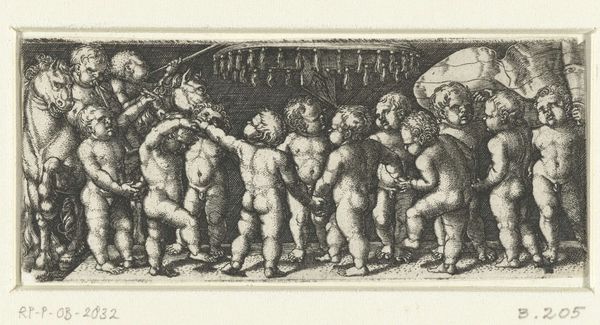 This is an etching by an anonymous artist, showing putti playing 'drop the handkerchief'. This image presents us with a window into the cultural and social life of the time, likely made in the Netherlands. The game, which is still played today, speaks to a shared experience across generations. The portrayal of putti, or cherubic figures, goes back to classical antiquity but was revived in Renaissance art, often used to decorate secular buildings and celebrate love and fertility. The association of these figures with play and innocence can be seen as reflecting broader societal attitudes toward childhood. These carefree putti frolicking in a garden setting could represent a nostalgic vision of carefree childhood, far removed from the realities of daily life for many at the time. As art historians, we examine such images through a wide lens, using historical texts, game studies, and cultural analyses to better understand the social meanings embedded in them.