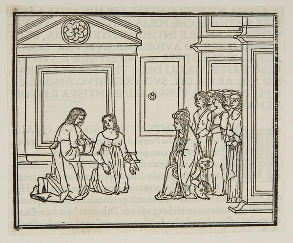 Editor: This anonymous print, "Book IV.44. Postumia is charged and freed from breach of chasitity," presents a scene of judgment. The woman in the center seems to be pleading her case. What historical narratives might this scene represent? Curator: This print resonates with many historical moments where women's bodies and reputations became sites of intense scrutiny and judgment. Consider how such images reinforced patriarchal structures. The act of judging Postumia becomes a performance of power. What do you make of the composition, with the woman positioned between the male judges and the other figures? Editor: It feels as if she is alone, despite being surrounded by others. Curator: Precisely. The image also subtly perpetuates the male gaze. It invites us to consider how historical representations of women in legal or moral contexts often served to control and silence them. What do we learn from examining these power dynamics? Editor: I see how art can reveal the subtle ways in which societal norms impact the individual. Curator: Exactly. By understanding these dynamics, we can begin to deconstruct them.