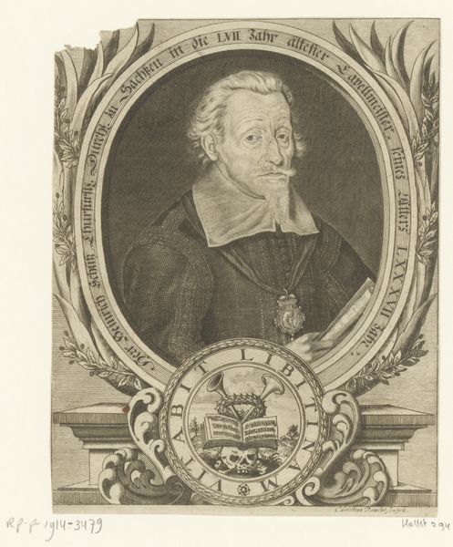 Curator: Before us, we have an engraving titled "Portret van Pierre d'Ailly." Its creation is dated somewhere between 1713 and 1763. It’s currently held at the Rijksmuseum. Editor: My first impression is one of severe austerity. The crisp lines of the engraving give a sense of cool detachment, a man scrutinized. Curator: Indeed. Observe the composition; the portrait, contained within a decorative oval, is set above a panel featuring symbolic objects – scales prominently displayed. The balance and precision in the lines evoke rationality. Note how the oval frame softens the sharp geometry with its leaf ornamentation, adding layers to the visual experience. Editor: What strikes me is the context surrounding such depictions. Prints like this were crucial in disseminating images of power. A clergyman reproduced for a wide audience signals the enduring influence of the church and its figures in society, far beyond the walls of any cathedral. Curator: Precisely, it highlights the dialectic. His stern expression, meticulously rendered by the engraver, enhances the gravity associated with his office. His gaze projects intellectualism. The hat signifies belonging to clergy. The choice to present him in profile flattens him to a representative of authority. Editor: It is fascinating to consider the power dynamics embedded in these reproductions. Was this image intended to inspire piety, fear, respect, or something else entirely? Was it even authorized? Engravings can function as propaganda and as records, playing a significant role in shaping historical narratives. Curator: A multi-layered artifact indeed, both for the symbolic language embedded in the visual construction and for the ways that reproduction impacts historical perspective. Editor: Looking at this print, one sees not just an image but a historical document of power and representation during the Baroque period. It gives a face to institutions.