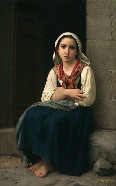 William Bouguereau's "The Shepherdess" is painted with oil on canvas. The artist has used traditional fine art materials to depict a scene of rural labor. Bouguereau’s work is marked by its highly polished, almost photographic realism. Oil paint, applied in thin layers and meticulously blended, gives this painting its smooth, porcelain-like surface. The artist's skilled technique is evident in the soft rendering of skin tones, the folds of the shepherdess’s simple garments, and the distant landscape. The detailed rendering of the figure and her surroundings is a testament to Bouguereau's mastery, achieved through careful observation and diligent craftsmanship. However, the work's realism obscures the realities of labor and class. By idealizing the shepherdess, Bouguereau presents a sanitized view of rural life. The artist's labor-intensive method contrasts with the life of leisure it depicts. Ultimately, "The Shepherdess" reminds us that materials and making always carry social and cultural meaning.