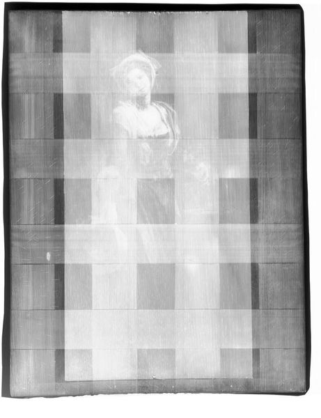 Curator: Here we have an untitled photograph by Martin Schweig, currently held in the Harvard Art Museums. It portrays a woman in a gown, posed on a staircase. Editor: Striking! The dramatic train of the dress and the imposing staircase create a sense of theatricality, almost staged. Curator: The crown and feather certainly contribute to that regal, almost allegorical, quality. The woman is elevated, both literally on the stairs and symbolically through her attire. It's as if she embodies some sort of virtue or ideal. Editor: The monochrome palette emphasizes the contrast in textures and the way light falls across the scene. The patterned wallpaper, the smooth dress, the solid banister all play against each other beautifully. Curator: Perhaps Schweig was interested in exploring how these familiar symbols of status and femininity communicate power. Editor: Yes, seeing the image this way allows me to appreciate the artistry that would otherwise go unnoticed.