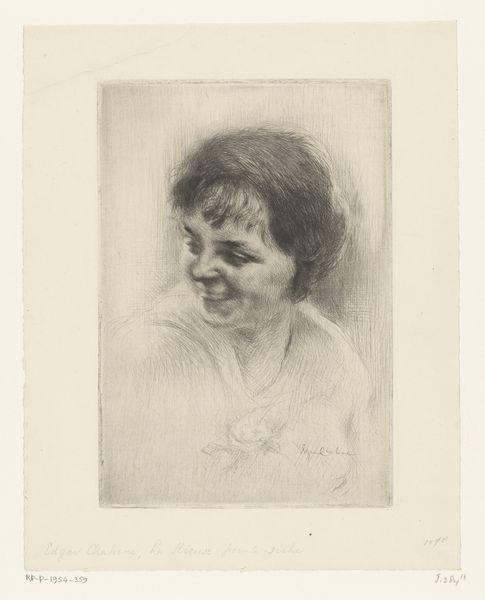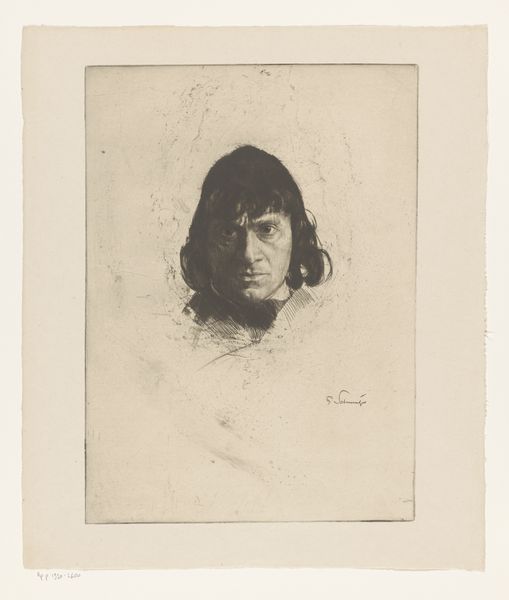 Editor: We’re looking at Rik Wouters’s "Self-Portrait," an etching made sometime between 1892 and 1916. It’s striking, almost haunting, in its simplicity. There’s a directness in the gaze. What do you see when you look at this work? Curator: I see a soul laid bare, don't you think? Wouters offers us something quite intimate here. The sketchiness, the raw quality of the etching, it feels like a fleeting glimpse into his inner world. Do you get the sense that he's trying to capture not just his likeness, but also something deeper? The emotional weight, the very act of self-reflection itself… I'm curious, what is he asking of us? What does he want us to *see* in him? Editor: It’s as if he’s asking "Do you see me?". Maybe that rawness makes it feel more genuine than a more polished portrait might. How much of that do you think is intentional? Curator: Oh, entirely intentional, I'd argue. Etching itself is such a physical, almost aggressive medium, scratching into the plate… it echoes, perhaps, the internal struggle. A conversation, quite a noisy one. Is he a person with too many voices? What story do they all tell? The way he renders his own features, the somewhat sunken eyes and sharply defined brow – what do they mean to us? He looks both vulnerable and intensely focused, which is quite a magic trick when you only have the barest tools at hand, and just think how that bareness informs our experience of the final piece. The power is in what *isn't* there, perhaps as much as what *is*. Editor: It really makes you wonder about the man behind the art. Thanks, I'll look at self-portraits very differently from now on. Curator: Exactly, this piece now reminds me to ask more, not less. Never stop digging beneath the surface.