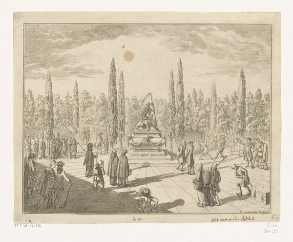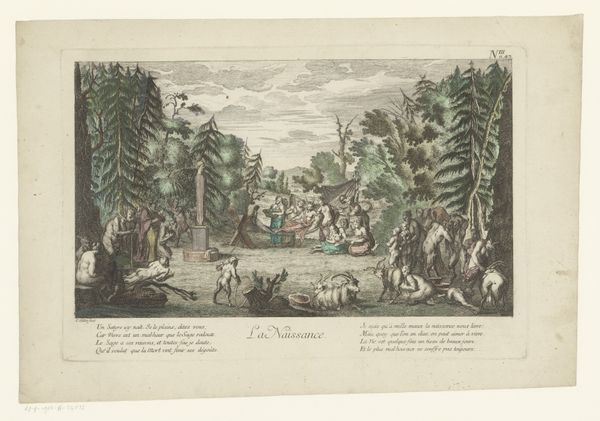 Editor: This engraving, "Grotto scene with Vulcan, from 'The marriage of the gods'" created in 1637 by Stefano della Bella, is incredibly detailed! I’m struck by the sheer number of figures and the fantastical landscape. What story do you think this image is trying to tell, especially with the figure of Vulcan present? Curator: The Grotto indeed serves as more than just a location. It's a threshold. Della Bella captures a layered reality, using the figure of Vulcan—a symbol of creation and destruction, fire and forge—to root us in a narrative that speaks of transformation. Notice how the figures, caught mid-action, suggest ritual, performance, and perhaps even the forging of alliances, literal and symbolic. Consider, what cultural narratives were alive then, where spectacle served political and social functions? Editor: The figures almost appear as if they're part of a ballet or theatrical performance. It definitely feels staged rather than like an actual event. The grotto, therefore, acts as a proscenium. Curator: Precisely! This is about more than visual documentation; it’s about constructing an ideal, infusing classical mythology with the theater of courtly life. Della Bella draws from a well of iconographic traditions, interweaving them with contemporary sensibilities. What enduring archetypes or power dynamics do you think such representations sought to reinforce, or even subtly challenge? Editor: It feels like it’s solidifying existing societal hierarchies, almost glorifying them within this mythical context, while suggesting that through transformation comes greater societal stability. Curator: Absolutely! In looking deeper into these emblems, in considering both overt symbolism and covert narratives, we begin to perceive the multi-layered messaging art carries—both as historical artifact and lasting reflection of human aspirations and tensions. Editor: It's amazing to consider how symbols carry so much intentional meaning and power. Thank you for shining a light on that for me.