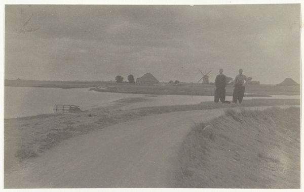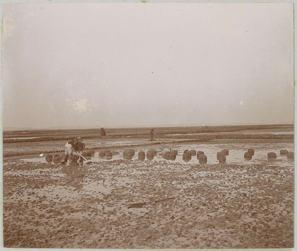 Curator: Ah, this gelatin-silver print from 1904 captures a scene titled "Twee mannen en een vrouw, mogelijk iets proevend op een wad in Frankrijk" — "Two men and a woman, possibly tasting something on a mudflat in France". It’s currently held in the collection of the Rijksmuseum. Editor: It's incredibly still... a photograph imbued with almost sepia tones. It's strange, a kind of mundane quiet fills the composition. Curator: The use of gelatin silver gives it a unique depth, capturing not only the physical appearance but also suggesting the prevailing atmospheric conditions, those wet, gusty wetlands perhaps. Notice how the horizontal lines created by the mud flats pull your eyes across the entire frame, meeting in the horizon. It is quite fascinating the composition creates an even separation between water, land and sky. Editor: It is a landscape of salt. I can almost taste the faint mineral scents just from the textural patterns etched onto the silvery emulsion. You almost feel the grit on the men's boots and that lady must feel the chill seeping through her woolen skirt. And those low horizons—like looking at the world through the eyes of someone kneeling. There's such rawness, so much grit in it! What exactly do you believe these souls were doing out on those exposed mudflats, searching away? Curator: Well, it might be the popular practice of collecting edible seaweed, a culinary practice still found today along the shores of the French coast! Or maybe a peculiar pastime of digging for mollusks to snack on—given its place in that bygone epoch! I enjoy contemplating what mysteries might surround this fleeting moment captured in a photograph, far beyond my awareness of those particular historical circumstances. Editor: It is a tableau that reveals beauty as transient phenomena existing throughout epochs, across cultures - with nothing more than salt marsh as my canvas and weathered beings posed upon wet sand awaiting tides... and perhaps they taste them directly! How divine is their experience? Curator: It makes one yearn for simplicity or feel empathy for their stark daily lives centuries ago. It invites pondering where it begins; however distant in memories those figures still taste when time moves forwards relentless against sands within our fingers too fast paced today, while standing right over. Editor: I find the simple lines, sepia tones evocative – a snapshot from another life but reflective mirror present! I sense my path.