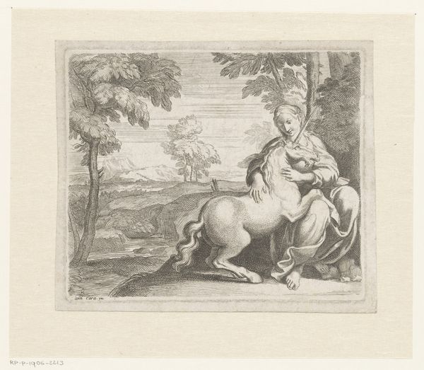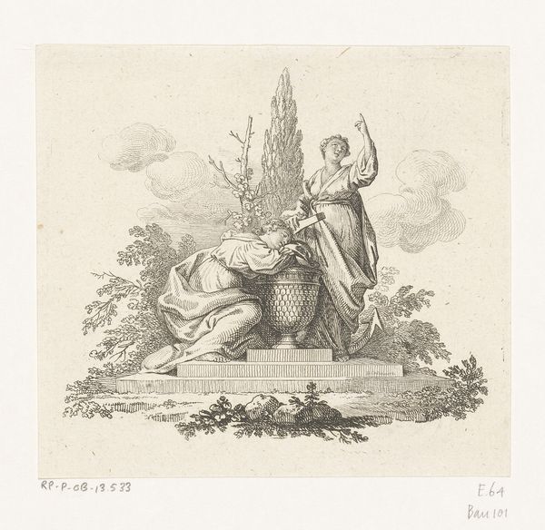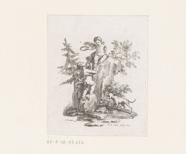 Noël Le Mire created this print of two kissing putti above a cave sometime in the 18th century. Le Mire was a prominent printmaker in France during a period when the institutions of art, like the Royal Academy, played a central role in shaping artistic taste and production. Here, Le Mire adopts a playful Rococo style, popular among the French aristocracy at the time. The image presents an idealized vision of childhood innocence and cherubic affection. The putti, or cherubs, were common motifs in art, often used to represent love or divine presence. These symbols aligned with the values of the French court, which emphasized elegance and pleasure. To fully appreciate this work, we can explore the prints and engravings that circulated in 18th-century France. This gives us insight into the period’s social and political climate. Understanding the environment in which Le Mire created this print helps us interpret the role of art in reflecting and shaping cultural values.