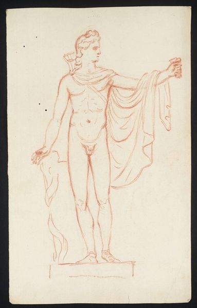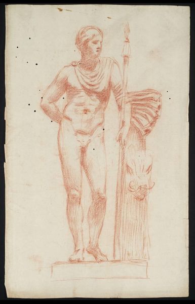 Editor: This is an undated drawing by Prince Hoare, housed at the Tate. The figure feels classical, a bit melancholic even. What do you see in this piece? Curator: The red chalk hints at the classical tradition of academies, but more subtly, consider the figure's pose. Doesn't it evoke a sense of contrapposto, a visual memory of ancient Greek sculpture? Editor: Yes, I see that now! Is the sword also symbolic? Curator: Indeed. It's a potent symbol of power, justice, and sacrifice, echoing through centuries of art. What might it signify in this particular context, do you think? Editor: Maybe the sitter embodies courage or moral strength? It's fascinating how these symbols persist. Curator: Precisely. Visual language is a living, breathing thing.