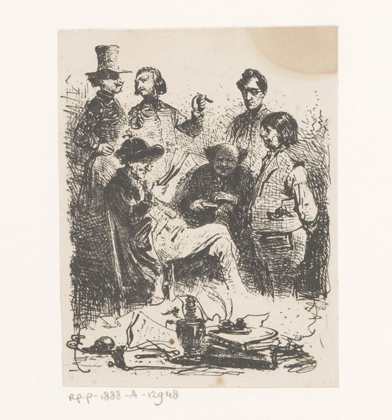 Ignatii Stepanovich Shchedrovskii created this print, titled "Scenes from Russian Folk Life," sometime in the mid-19th century. Shchedrovskii lived during a time of significant social stratification in Russia, with a rigid class structure that deeply affected daily life. Here, we see men of different social strata interacting. Two figures are deeply engaged in a card game, while others look on, smoking pipes. There’s an intense focus in the expressions and body language of the gamblers, set against the backdrop of rural Russia. The scene presents a slice of life that reflects the social dynamics of the time, revealing a fascination with the everyday experiences of ordinary people. Shchedrovskii captures a quiet, intimate moment that speaks to the universal experience of leisure and camaraderie. The print offers a glimpse into a society marked by both leisure and the rigid constraints of its time. It suggests an emotional landscape where the personal and the social intersect, inviting us to consider the complexities of identity and belonging in 19th-century Russia.