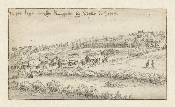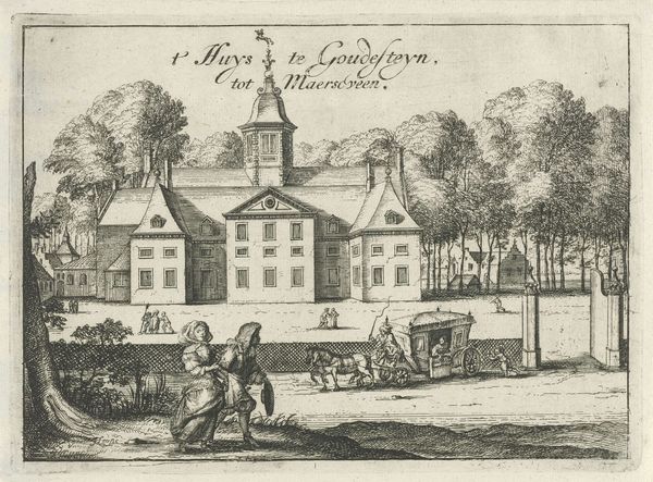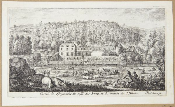 Editor: We’re looking at "Musicerende herder nabij kasteel Longuetoise," or "Musical Shepherd near Longuetoise Castle," an etching by Albert Flamen from around the mid-17th century. I’m struck by how…populated it is! All these figures, and animals, and then that dense forest behind the castle. It feels a bit like a stage set. What do you see in this piece? Curator: You know, I feel like Flamen is offering us a peek into a perfectly ordered world, at least, that's the fantasy. Everything is neatly arranged – the building, the trees. But then…oh, then you see the people, the animals, and that's where the wildness peeks through! Tell me, what's more distracting in this scene, the shepherds with the animals, or the imposing castle in the distance? Editor: Definitely the shepherds! It draws your eye much more than the castle. Curator: Exactly! To me, it almost hints at the inherent tension between the refined architecture, this man-made grandeur, and the… chaotic abundance of nature, right? A playful sort of contrast if you think about it! Maybe Flamen is quietly suggesting that true harmony comes not from dominance but from embracing the chaos. It's all interconnected. That musical shepherd *is* the castle. The animals *are* the landscape. Do you see how they become a cohesive tableau? Editor: That makes a lot of sense. I was focused on the individual elements but, put together, it almost has the feel of a pastoral daydream, you know? Curator: Oh, *daydream*, I love that! It’s as though the artist is reminding us that even in what seems ordered, there’s always that gentle breath of something wild and free. I am grateful to be reminded of this…