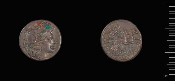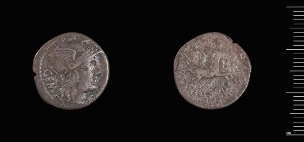 Curator: This is a denarius, a Roman silver coin issued by M. Calidius, Q. Caecilius Metellus, and Cn. Fulvius. Note its diminutive size, only 3.81 grams. Editor: It feels burdened, doesn't it? The imagery is crowded onto such a small surface, almost claustrophobic. Curator: Indeed. The obverse displays conjoined heads, likely personifications of Honos and Virtus, while the reverse shows Italia and Roma clasping hands. Editor: The clasped hands speak to unity, but the weight of those combined mythological figures suggests the immense pressure of Roman identity and expansion. Curator: Observe how the die-striking process itself contributes to the blurring of details, abstracting the symbolism. Editor: Ultimately, its small size belies its grand ambition. A pocket-sized empire. Curator: Precisely. A fascinating study in miniature. Editor: A dense microcosm, indeed.