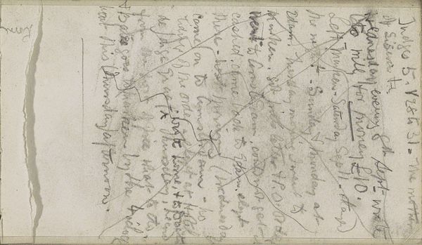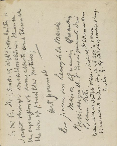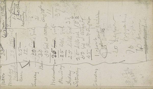 George Clausen made this drawing, "Lijst van aankopen," using pencil to create a stark contrast between the pale paper and the dark, energetic lines of his script. The shopping list is arranged vertically, a cascade of notations that fill the frame. The composition is dense and immediate, reflective of a utilitarian purpose. The casual arrangement of elements, like the size of pots, jars, and clothing items, creates a visual rhythm. Clausen meticulously records each item and its price. These lists possess an inherent structure similar to those of minimalist compositions that elevate everyday objects into studies of form and balance. Ultimately, this drawing functions as a semiotic exercise, where the artist employs signs—words and numbers—to represent tangible objects, a testament to how even mundane documentation can reveal the underlying structures of representation. It asks us to reconsider how we assign value and meaning through language and visual form.