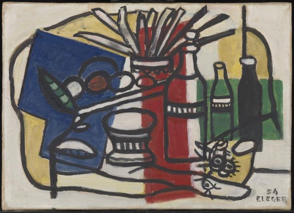 Editor: Here we have Fernand Léger’s "La Bouteille Bleue," painted in 1950 using oil on canvas. The painting has a bright, almost cartoonish quality with its simplified shapes and bold colors. I find it quite playful. How do you interpret this work? Curator: This painting, for me, reflects Léger’s postwar optimism and his engagement with the social and political context of his time. He believed art should be accessible and relevant to everyone, particularly the working class. Can you see how the simplified forms and bright colors contribute to this accessibility, moving away from the elitism often associated with fine art? Editor: I see what you mean. It doesn't feel intimidating. But what about the objects themselves—the bottle, the basket? Curator: These objects, typical of still life, are rendered in a way that deconstructs traditional notions of representation. It speaks to a larger theme of societal reconstruction. Consider the industrial materials Léger often depicted. Does this composition also relate to themes of labor, production, and everyday life in postwar France? How do those elements shape our understanding of identity during the era of reconstruction? Editor: So it's not just about making art accessible, but also about elevating everyday objects and experiences to the level of art. Curator: Exactly. It's about challenging the hierarchy, suggesting that beauty and significance can be found in the mundane. Moreover, the flattening of space challenges traditional hierarchies of perspective and value, relating this painting to conversations on accessibility. What does art mean after mass trauma? What did it look like, who was it for, and whom did it include? Editor: That makes me see it in a whole new light. Thanks for showing me the sociopolitical relevance. Curator: My pleasure. Art is never created in a vacuum, after all! Considering the cultural and historical circumstances deepens our appreciation of any artwork.