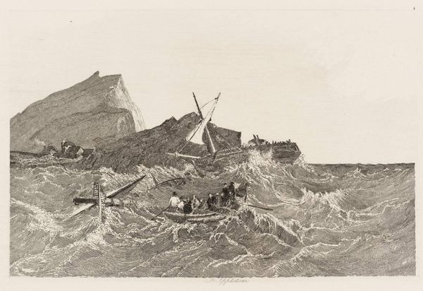 Editor: So, here we have Clarkson Stanfield’s "East Cliff, Hastings," an engraving held at the Tate. The choppy water and precarious boats really convey a sense of risk. What do you see in this piece beyond the surface level? Curator: Well, engravings like this one were often reproduced and circulated widely. Consider the role these images played in shaping public perception of coastal life and the maritime industry. Editor: How so? Curator: Think about the intended audience. Was this meant to romanticize the lives of fishermen, or document the challenges they faced? Images like this can reveal a lot about social attitudes toward labor and the sea. How might that influence our understanding of British identity at the time? Editor: That's a great point. I hadn’t considered how widespread images like this shaped public opinion. Curator: Exactly! It’s a reminder of the power of images to influence culture. Editor: I'll definitely look at art with a wider lens from now on.