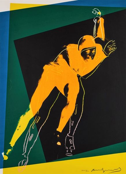 Curator: Looking at this dynamic artwork by LeRoy Neiman from 1973, simply titled "Nate Thurmond," the energy just leaps off the canvas. Editor: The yellow immediately grabs your attention. And those thick strokes of acrylic paint—you can practically feel the physicality of the game itself. It’s pure impasto, a real celebration of materiality. Curator: Exactly. Neiman captures not just the image of Thurmond, but also something of his power, his cultural significance, and the larger-than-life status of sports icons within the social fabric of the 1970s. He moves with confidence despite being constantly heckled, discriminated against, and villainized in the media as many of his black teammates in sports have faced. The neo-expressionist handling reminds us that it is not just basketball at stake. Editor: And the quickness of application, with that limited color palette over that background... it is evocative of how the spectacle becomes this larger than life image. This artwork captures this specific subject matter that in itself becomes a social spectacle that gains significance over time. Curator: I find it interesting that the artist chose such vibrant tones juxtaposed with almost crude forms, as though reality itself cannot contain such displays of excellence or triumph when considering who we celebrate as icons, what bodies we choose to exalt. It poses questions of performativity as political statement. Editor: Right, there's this raw quality that makes you think about production. What kind of brush did he use? How quickly did he apply those colors to achieve this feeling? And how were these celebrated athletes commodified as celebrities, emblems, brands. Curator: It also reminds me of a time when athletes such as Thurmond and other Black players were actively transforming sports and culture by simply competing. Through their play, labor, excellence on the court they were taking a stance about civil rights, freedom of expression and so much more. Editor: It really makes you think about how the art itself operates as a means of production for immortalizing the performance of the athletic body and what it means to create, exhibit, consume art. Curator: I'm drawn to how this artwork makes visible both an athlete and a very specific historical moment, both its material circumstances as well as the social politics it encapsulates. Editor: It has definitely expanded my sense of materiality and production—the context of both the game and the work itself.