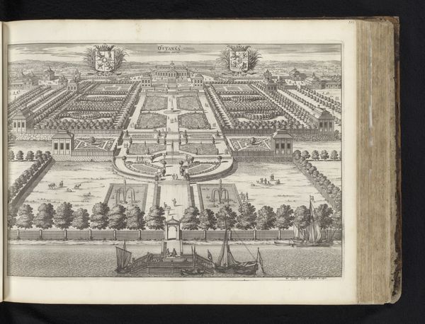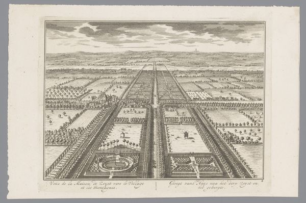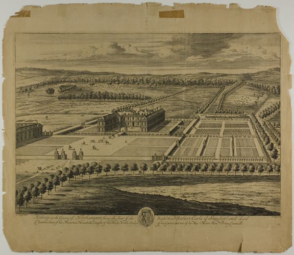 Editor: So this is “Wimple in the County of Cambridge, plate 32 from Britannia Illustrata,” possibly from 1707, by Johannes Kip. It's a print of what seems to be an estate. It feels very formal and ordered; what catches your eye in terms of composition and form? Curator: The unwavering linearity is immediately striking. Notice the relentless application of perspective, directing the gaze forcefully towards the vanishing point on the horizon. The formal gardens, rendered with geometric precision, exhibit a rigorous control over nature. How does the etching’s line quality contribute to this sense of order, would you say? Editor: Well, the precision of the etched lines definitely reinforces the idea of control. Everything looks very deliberate, not organic at all. Curator: Precisely. Also note how the architectural structures, especially the main house, mirror and reinforce the axial symmetry established in the gardens. Consider how the artist used the medium to its fullest extent. Where does the visual hierarchy take the viewer's attention? Editor: I think my eyes keep returning to the main house because it's so centered and also the largest element. Curator: Exactly. The calculated organization and visual relationships creates a sense of grand design and masterful execution, which I think aligns with Baroque sensibilities about order and reason. Is there an emotional response that comes from that, or is the cool precision itself the affect? Editor: It makes me feel slightly detached, almost like observing from a great distance. I do appreciate how every visual decision relates and amplifies the theme. Curator: Indeed. The structural elements harmonizing under the umbrella of formal constraint is remarkable. Thank you.