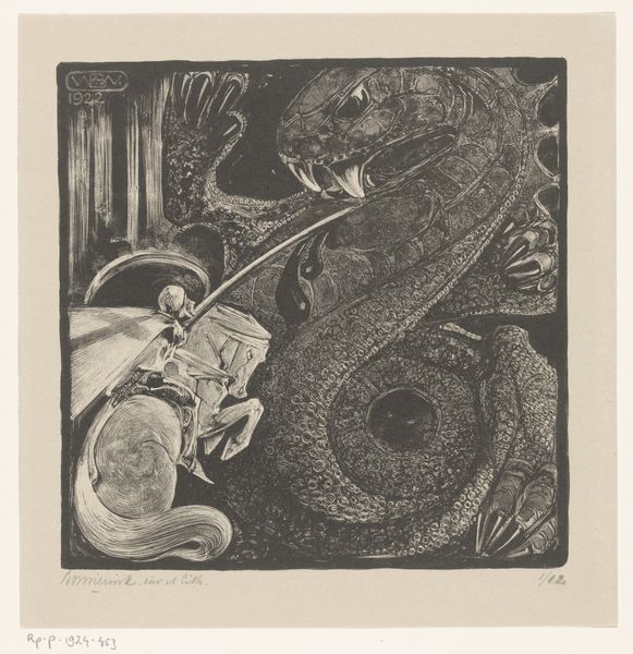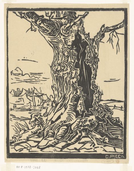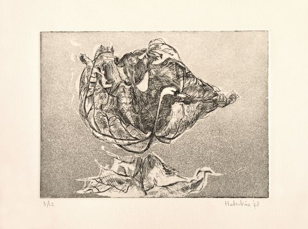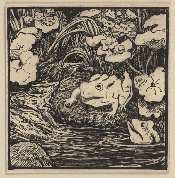 Curator: This intriguing piece is "Drie naaktslakken op een kool," or "Three Slugs on a Cabbage," a work whose creation is attributed to Julie de Graag and thought to have been made between 1887 and 1924. The medium is woodcut. Editor: Stark. The contrast between the stark white and deep black creates a slightly unsettling feeling, don't you think? There’s something vaguely menacing about it. Curator: It’s a powerful use of negative space to create depth. The texture, achieved through meticulous carving, almost makes you feel the roughness of the cabbage leaf and the smoothness, paradoxically, of the slugs. It’s a real study in contrasts. Editor: Well, this artist was indeed active in a period defined by intense change, between post-Impressionism and early Modernism. What do you make of its stark, almost primitive nature? Does it reflect a wider social mood? Curator: Considering the socio-political climate of the early 20th century, this artwork invites discourse. The vulnerability of the slugs, juxtaposed against the sturdy cabbage, might symbolize the frailty of life amid industrial transformation. Editor: The formal properties also hint at broader trends in the art world at the time. Note how De Graag simplified her forms, abstracting nature to almost graphic elements. This visual economy gives it tremendous force. Curator: Absolutely. It's line is distinct. How does the subject affect your interpretation? Editor: The presence of garden pests shifts everything! Are they invasive species or simply part of a vulnerable ecosystem. Curator: A poignant interpretation when considered from the environmental crises we face now. A timely consideration that I hadn't considered until now! Editor: Indeed. Art from the past, looked at anew. I feel a new awareness when I view these works with a modern lens, thank you!