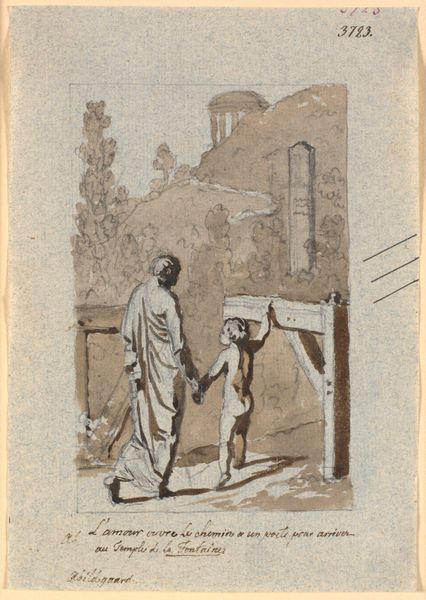 Curator: The sepia wash gives this British School drawing, "Jane Shore Doing Penance through the Streets of London between Two Monks," an immediately somber feel. Editor: It's striking how the tonal range emphasizes the texture of their robes, especially juxtaposed with Jane Shore's apparent distress and the imposing architecture looming in the background. Curator: Indeed, note how the artist uses line to direct our gaze—from the monks' somber faces to Jane's bowed head and clasped hands, embodying humility and shame. The work exemplifies 19th-century interpretations of morality. Editor: Yes, and it’s hard to ignore the historical power dynamics. Jane Shore's story, a woman punished for her sexuality, resonates uncomfortably with continued societal judgements against women, even today. Curator: A potent reminder that depictions of penance aren't just aesthetic exercises, but reflections of the social norms of their time. Editor: Precisely, art serves as a mirror, reflecting and often perpetuating, the values we hold.