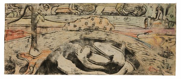 Editor: So, this is Paul Gauguin’s print “L’univers est crée (The Universe Is Being Created)” from 1893-94. It’s an etching printed on paper, and the longer I look at it, the more dreamlike and otherworldly it feels. It’s hard to make sense of what's going on; what do you see in this piece? Curator: It’s fascinating, isn't it? The layering of figures, the way the human merges with the animal… It speaks volumes about Gauguin’s interest in primal creation myths and the interconnectedness of life. The composition reminds me of illuminated manuscripts. Notice how the figures seem suspended, almost floating, in this dark, undefined space. Editor: Yeah, I see that, it's almost like he's not trying to depict a real scene, but some sort of symbolic, inner vision? The title hints at a grand narrative, but I'm having trouble reading it. Curator: Exactly! It's about accessing something pre-linguistic, a shared ancestral memory, almost. Think about the Tahitian influences that were so important to him. The repeating motifs and ambiguous forms create this symbolic vocabulary; it’s Gauguin’s way of evoking the mysteries of existence before logical understanding takes over. Are there any symbols or images that particularly draw you in? Editor: The figure in the lower left - is it a woman? - she almost looks like a memory of Eve, turned away, as other figures move right into the “new” universe. Also that fantastic animal towards the right, emerging from the darkness with a sort of primal force… Curator: Yes, I find that beast evocative as well! This blend of fear and awe mirrors humanity’s complex relationship with the natural world, as explored across cultures from Ancient Greece to the Pacific Islands. And your intuition about the figure’s associations with Eve may carry a key insight into Gauguin’s interpretation. The print wrestles with complex ideas of paradise, creation, and our place in it all. Editor: I see it differently now! I hadn't picked up on how much it was about the symbolism and creation myths that repeat across cultures, which brings the work to another level. Thanks! Curator: And thank you for helping me consider anew the enduring power of Gauguin’s symbolic language!