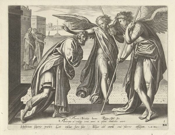 Philips Galle created "Lot and the Two Angels" sometime in the late 16th century, an engraving notable for its intricate lines and carefully constructed composition. The scene is dominated by the figures of Lot and the angels, arranged in a dynamic formation that pulls the viewer's eye across the print. Notice the tension between the earthly and the divine, emphasized by the contrasting textures and forms. Galle's use of line creates a palpable sense of movement, particularly in the billowing robes of the angels and Lot's strained posture, as they urge him to flee. This directional pull not only serves a narrative purpose but also engages with the broader artistic and philosophical concerns of the period. The print destabilizes our expectations through its meticulous detail and dramatic presentation. As you contemplate Galle’s work, consider how its formal qualities function not just aesthetically but also as part of a larger cultural discourse. The image is a site for ongoing interpretation and re-interpretation.