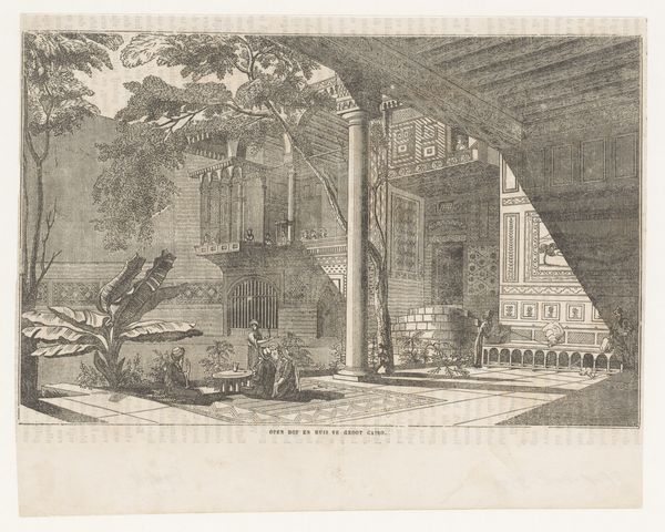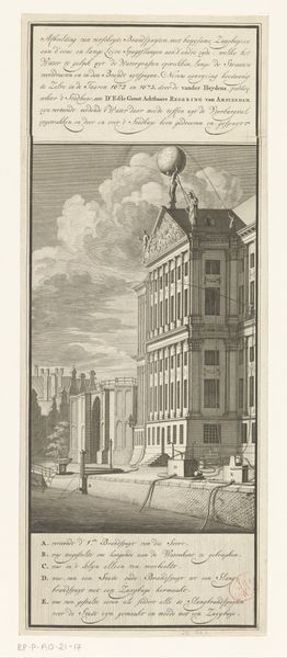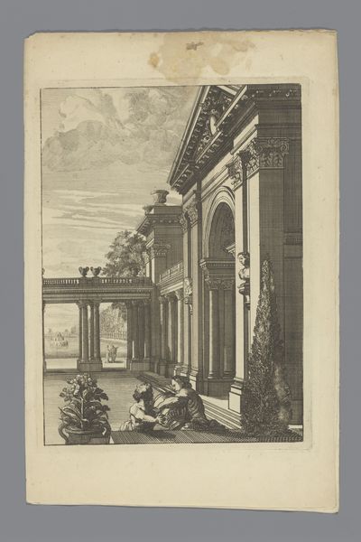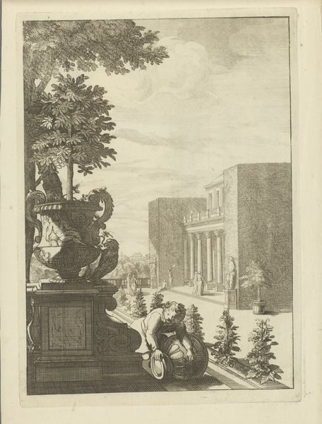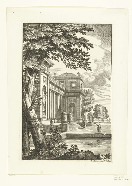 This is an etching of two houses and fountain basins created by an anonymous artist. The artwork’s structure features a balanced composition, with architectural forms and natural elements creating a harmonious, yet somewhat rigid scene. Notice the geometric precision in the buildings, contrasted with the organic shapes of the trees and water. The etching technique emphasizes line and texture, giving depth to the monotone palette. The interplay of light and shadow defines the forms, casting the fountain in stark relief. The structured layout evokes a sense of order and control, reflecting broader artistic concerns. The fountain’s water is a symbol, perhaps alluding to the constant flux and fluidity of life. The artist uses formal elements to negotiate the relationship between nature and artifice. The artwork invites contemplation, suggesting that meaning is not fixed, but emerges from the interplay of form, context, and interpretation.
