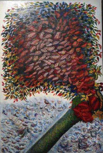Curator: Oleg Holosiy’s 1992 oil painting, "Wounded Bud," presents us with an intriguing study of form and, as the title suggests, vulnerability. What strikes you first about it? Editor: The colors are muted, almost sepia-toned, and it evokes a feeling of fragility, like something precious is concealed, or perhaps injured, within the petals. Curator: The imagery, while seemingly abstract, gestures towards the organic. Considering Holosiy's broader body of work and the political climate of the early 90s in Ukraine, the "wounded bud" might symbolize the delicate hopes and potential of a nation undergoing significant transition. Editor: That's a compelling reading. The bud as a symbol of potential, tinged with a sort of trauma seems visible here. But what of the deeper symbolism here? Buds typically represent nascent growth, don’t they? The anticipation of future beauty and strength. Curator: Precisely. In post-Soviet Ukraine, Holosiy, alongside other artists, grappled with questions of national identity, artistic freedom, and the scars of a complicated history. It's possible this abstract form is a visual representation of those very abstract yet pressing concepts. The work seems to engage with feminist concerns regarding vulnerability and suppressed potential as well. Editor: Yes, I'm particularly drawn to the starkness of that one streak of bright red amid all that muted gold and brown. In a context of new-found national identity that singular bold stroke represents a vital, essential force that needs protection and support. Curator: The painting encourages us to consider how historical context shapes artistic expression. What seems purely abstract on the surface reveals deeper layers of meaning when examined through the lens of social and political realities. Editor: Indeed. It's a powerful reminder of how symbols can act as both personal and collective repositories of meaning. Holosiy’s choice of subject reveals much of a generation's dreams deferred. Curator: A generation grappling with their country’s re-birth. It’s works like "Wounded Bud" that push us to rethink notions of history. Editor: It challenges us to think beyond simplistic visual impressions.
