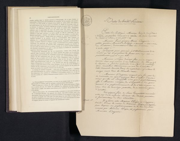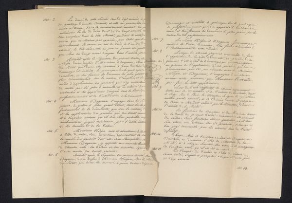 Curator: This is a manuscript dating from around 1840 to 1841. It’s titled "Handschrift betreffende Pieter van Huffel." Editor: It strikes me immediately as a work demanding intense study. There’s so much dense writing, it feels incredibly personal and cryptic at once. Curator: It certainly is. What we have here are several sheets of paper covered in ink. These handwritten pages give insight into Johannes Immerzeel’s perspective. Editor: Ink on paper – a very direct, unadorned medium. I'm intrigued by the commitment it signals: the physical act of writing, word after word. What exactly did Immerzeel want to convey about Van Huffel? Curator: Immerzeel was deeply engaged with issues of representation and historical narrative. These texts relate to a portrait, situating Van Huffel within the broader cultural discourse. Van Huffel's identity, his status, would all be brought under scrutiny by Immerzeel. Editor: It is evocative of secret messages or codes. Calligraphy itself has a long and interesting cultural association – connecting identity, authority, and artistic expression. Do you feel there’s an element of deliberate obscurity? Curator: Obscurity isn't accidental here. Texts like this force us to recognize the social structures that frame both artistic production and the lives represented. Who gets remembered, and how? And how can the visual markers such as in portraiture further a narrative? Editor: It also shows the significance that handwriting had – think of the different implications there are now. How can we relate to written messages today when they can easily be altered and not necessarily tied to one individual? Curator: The layering is really interesting. Each pen stroke creates something meaningful, almost ceremonial about written language, now mostly vanished in a digital age. Editor: Precisely. Each choice holds layers of conscious and unconscious meaning. Examining how Immerzeel constructs the legacy of Van Huffel offers so much to explore in terms of memory, history and cultural narrative. Thank you, this has offered so much for reflection.
