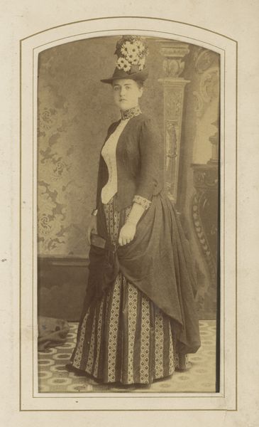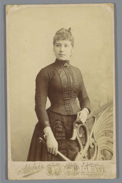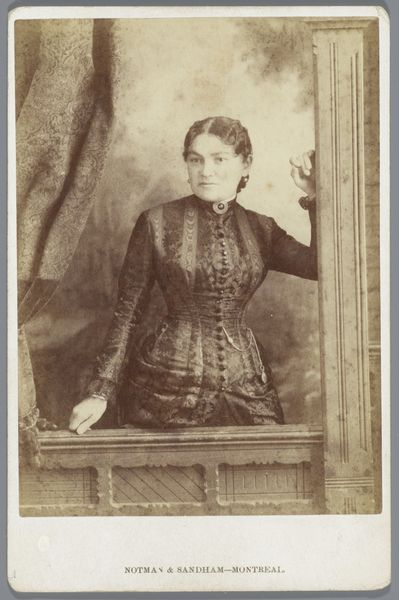 Curator: Well, hello there! I’m absolutely captivated by this image: "Portret van een onbekende vrouw bij een tafel", created between 1880 and 1890 by A. Bernard. A real gem of a gelatin-silver-print! Editor: Sepia dreams! It strikes me as poised, elegant... and ever-so-slightly melancholic, like a hushed melody. The light seems to embrace her in a gentle sort of way. Curator: Precisely! See how the photographer employs the table as a compositional anchor? The verticality of its pedestal is then echoed in the tight lines of her bodice, a subtle, powerful semiotic gesture towards the social constraints she must have lived with. Editor: Or perhaps, how she chose to embrace them? There's defiance too, in her gaze, a confidence in how she fills the space. The delicate fan becomes both adornment and a weapon—hiding and revealing her intentions all at once. Curator: Indeed, the accessories work overtime here! That heavy necklace and ornate cuffs play out against the relatively austere background to amplify a statement of cultivated restraint. It invites all kinds of psychological readings! Editor: I'm caught by how that almost creamy quality in her skin and clothing sets off a cascade of associations—lace, shadows, whispered secrets, the touch of fine fabric... it pulls at your senses, doesn't it? You just want to know her story! Curator: Don’t we all? Photographs like these create the ghost of a life that never quite disappears. Every mark and shade bears traces of lived experience. Editor: Exactly! It leaves you feeling that, sometimes, art is just an echo—a very beautiful, sepia-toned echo of ourselves. Curator: Indeed. And with that, our echo must fade, until next time.