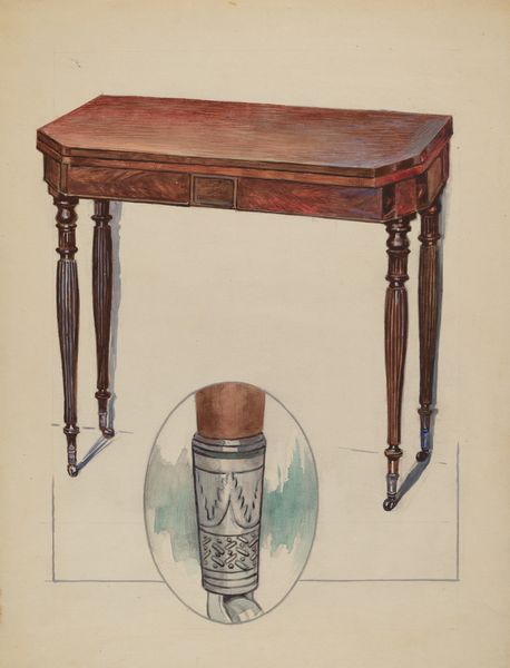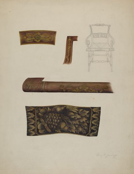 Curator: This is Bessie Forman's "Card Table," made around 1936, using watercolor, colored pencil, and charcoal drawing techniques. Editor: It feels like a very controlled and careful rendering, almost architectural in its precision. The somber color palette reinforces that measured feeling, doesn't it? Curator: Absolutely. Think of the symbolic weight of the card table itself. In domestic spaces, it represented a zone of leisure, but also a place for social rituals and, often, the negotiation of fortunes. Editor: Yes, there's a tension there. These objects presented apart feel almost clinical. The formal approach distances us. Curator: See the deliberate depiction of carved details: the leaf patterns that recur on the legs, the pedestal, and even the disembodied fragment in the top right? These aren't mere embellishments; they're signifiers of status, connecting the table to a tradition of refined craftsmanship. Think about the enduring fascination with the past as manifested in these details. Editor: It's a studied formalism in which the artist’s academic practice reflects their rigorous approach. It is almost like a taxonomical drawing: specimen parts methodically positioned on a surface. There is a distinct feeling of coldness. Curator: Interesting. Perhaps Forman intended to dissect the object, visually stripping away its social context to reveal the underlying design principles. It speaks of the power inherent in the design. Editor: I can see that. The very even lighting also reduces drama, making us notice the pure form. Its somber palette may actually symbolize something. It is clearly an academic interpretation from its time, yet also a modern one by fragmenting it into components for contemplation. Curator: The repetition of foliate forms across all three images subtly underscores the continuity of artistic tradition. The objects and symbols speak of more than simply surface decoration, though. Editor: A coolly observant record then, rather than a warm invitation to play. An academic eye at work... I find the semiotic interplay of presentation and representation compelling. Curator: Indeed. Studying objects gives new insight into human experience, from social hierarchies to decorative expressions, to human agency itself.