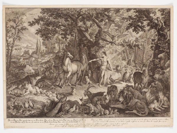 Johann Elias Ridinger created this print of "The Expulsion from Paradise" sometime in the 18th century. Here we see Adam and Eve banished from the Garden of Eden, an episode laden with religious and cultural significance. Made in Germany, the image reflects the period’s complex relationship with religious narratives, filtered through the lens of the Enlightenment. Note the emphasis on the natural world, with animals and detailed landscapes dominating the composition. This could represent the increasing interest in natural history during this period. The scene is orderly, which may reflect the prevailing societal values and the desire for social order within the German states of the time. The viewer should be asking themselves: What does it mean to create a seemingly harmonious image of such a chaotic and transformative event? To understand such images better, we look to religious texts, social histories, and the biographies of artists like Ridinger, to understand the complex exchange between art, belief, and society.