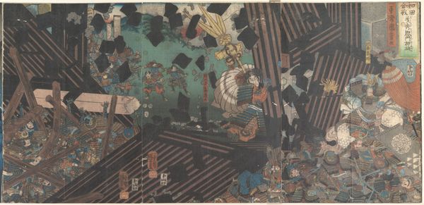 Curator: Let's explore this 1860 woodblock print titled "Foreigners during a Drinking Bout in the Gankiro Teahouse" by Utagawa Yoshiiku, now residing in the Rijksmuseum collection. Editor: Immediately, I’m struck by the depiction of this interior and the seemingly raucous scene it contains. The woodblock’s layering creates a wonderful depth. Curator: Indeed. It offers a window into a specific historical moment. The work provides a glimpse into the evolving intersection between Japan and the West during the late Edo period, a time of increasing foreign presence. It reflects the societal tensions and curiosities surrounding cultural exchange and difference. The figures themselves become objects of spectacle. Editor: Focusing on materials, it's a wonderful demonstration of the woodblock medium. The precise carving of the faces and the way the different blocks combine to give us rich color and graphic texture. I am wondering how access to different dyes played into the imagery. Curator: The Western figures' boisterous demeanor contrasts sharply with the quieter observations of the surrounding Japanese, and it serves as commentary on the perceived cultural clashes. Editor: And these cultural differences are materially visible: Western style clothing against the more muted garments of the geishas; porcelain tea service versus possibly imported glass bottles. Curator: Precisely. Considering power dynamics inherent in cultural representations, Yoshiiku presents us with a critical view of cross-cultural encounters. What were the working conditions of Yoshiiku? Did the artisans collaborate to depict the scene accurately, or from second-hand reports? It provokes many critical questions about access, identity, and even the male gaze, since these spaces were traditionally gendered in a certain manner. Editor: Good point. Focusing on the craftsmanship brings new dimensions of understanding of historical power dynamics. It leaves us to wonder about the socio-political landscape surrounding its creation. Curator: Analyzing "Foreigners during a Drinking Bout," we gain insights into a pivotal period in Japanese history, along with questions about globalization, identity, and representation. Editor: Looking at it materially reveals the rich intersections of culture, class and representation embedded in what we understand today as globalization.