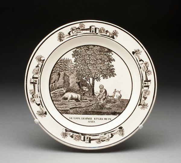 This plate was made by the Montereau Pottery, but the date of production is unknown. It's earthenware, made from clay fired at a relatively low temperature, and decorated with an intriguing monochrome transfer print. The technique used to decorate this plate, transferware, speaks volumes about the industrialization of ceramics. The design was first engraved on a copper plate, then printed onto paper, which was then carefully applied to the pottery surface. The print was then transferred to the plate using heat. This allowed for detailed imagery to be applied quickly and consistently, reflecting the rise of mass production. Notice the scene depicted; it has a narrative quality, almost like a printed illustration. Transferware like this made art accessible to a broader audience, turning everyday objects into canvases for storytelling. The plate is a reminder that even the most humble objects can carry rich cultural and social meaning. The techniques used in its creation democratized art, bringing imagery once reserved for the elite into ordinary homes.