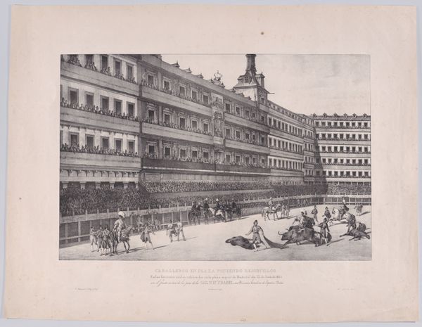 This print, made by an anonymous artist, depicts a bullfight in the Plaza Mayor of Madrid. Bullfighting in Spain has a long history, dating back to ancient Iberian rituals and solidifying as a public spectacle by the 18th century. Here, the Plaza Mayor itself becomes a stage for the drama of the bullfight. The architecture looms large, its balconies packed with spectators, emphasizing the social and institutional context of the event. The artist captures the excitement, but also the ritualized nature, of the spectacle. The Plaza Mayor, originally designed to stage public events that would burnish the image of the monarchy, literally frames the image of social power. Understanding this print requires a careful examination of Spanish social history, the role of the monarchy, and the cultural significance of bullfighting itself. By researching historical accounts, we can gain a deeper appreciation for the complex interplay of power, spectacle, and tradition embedded in this image.