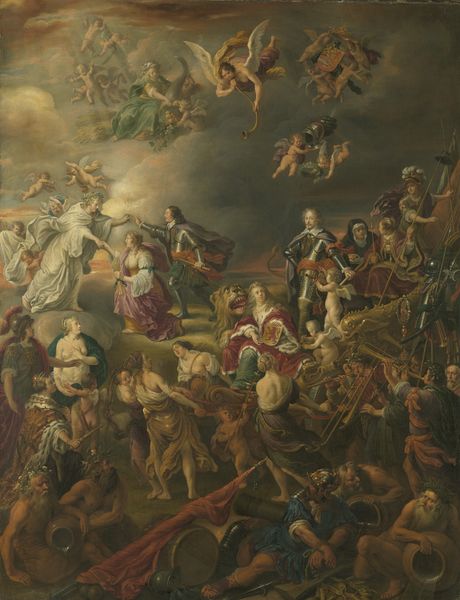Editor: So, this is "A Battle" by Thomas Stothard. It's an oil on canvas, housed at the Tate. It feels chaotic and dramatic to me, like peering into a swirl of conflict. What strikes you when you look at this, in all its fury? Curator: It's that churn, isn't it? Stothard really captures the visceral energy. The brushstrokes almost feel like slashes. Notice how the figures are interwoven, it is like a dance of death. It makes me think about how history is always up for grabs, a swirling narrative of power and loss. Does it conjure up a particular historical moment for you? Editor: Not really a specific one, more the general feeling of... upheaval. That's a good point about history being contested. I hadn't considered it that way. Curator: Right? It reminds me that history isn't a set of facts, but a collection of subjective experiences. Food for thought, right? Editor: Definitely. I'll remember that, thanks!